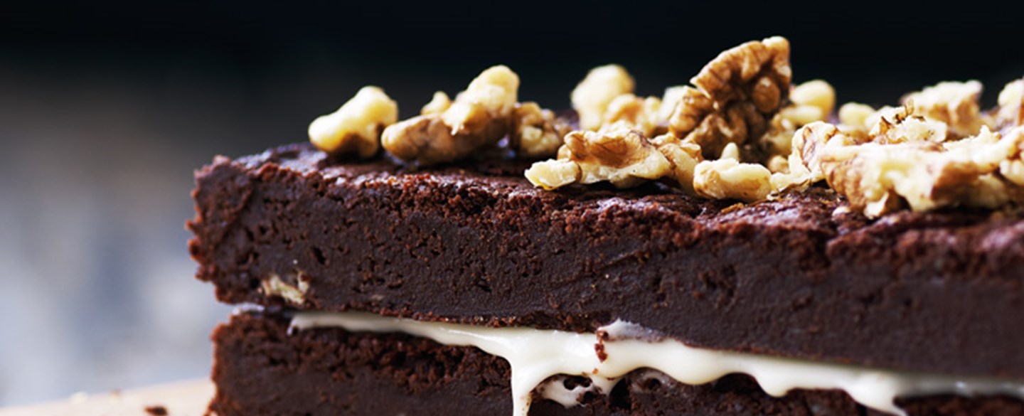 Chokolade, smør og sukker smeltes sammen ved svag varme i en gryde. Pisk æg, mel, lakridspulver og valnødder i og kom dejen i velsmurte lagkageforme. Mængden af dej afhænger af, hvor mange personer der skal laves til. For eksempel, til 4 personer bruges 2 lagkageforme. Bag ved 160 grader i ca. 40 minutter. Sluk for ovnen og fortsæt bagningen til kagen er gennembagt, ca. 10 minutter. Tjek med en kødnål, at den er gennembagt. Afkøl 10 minutter inden formens kant fjernes. Afkøl helt.