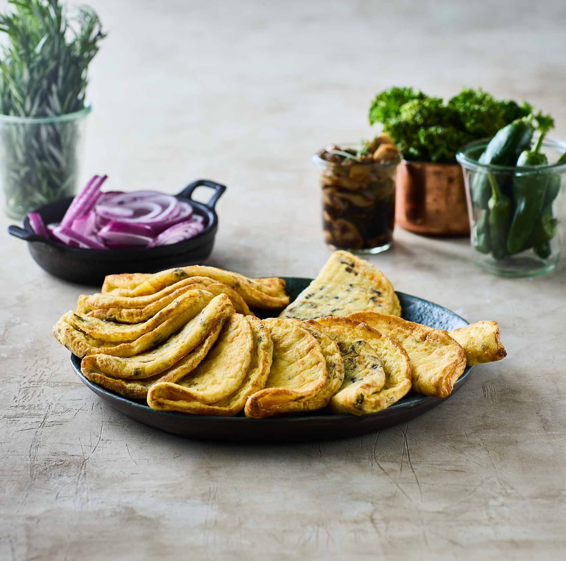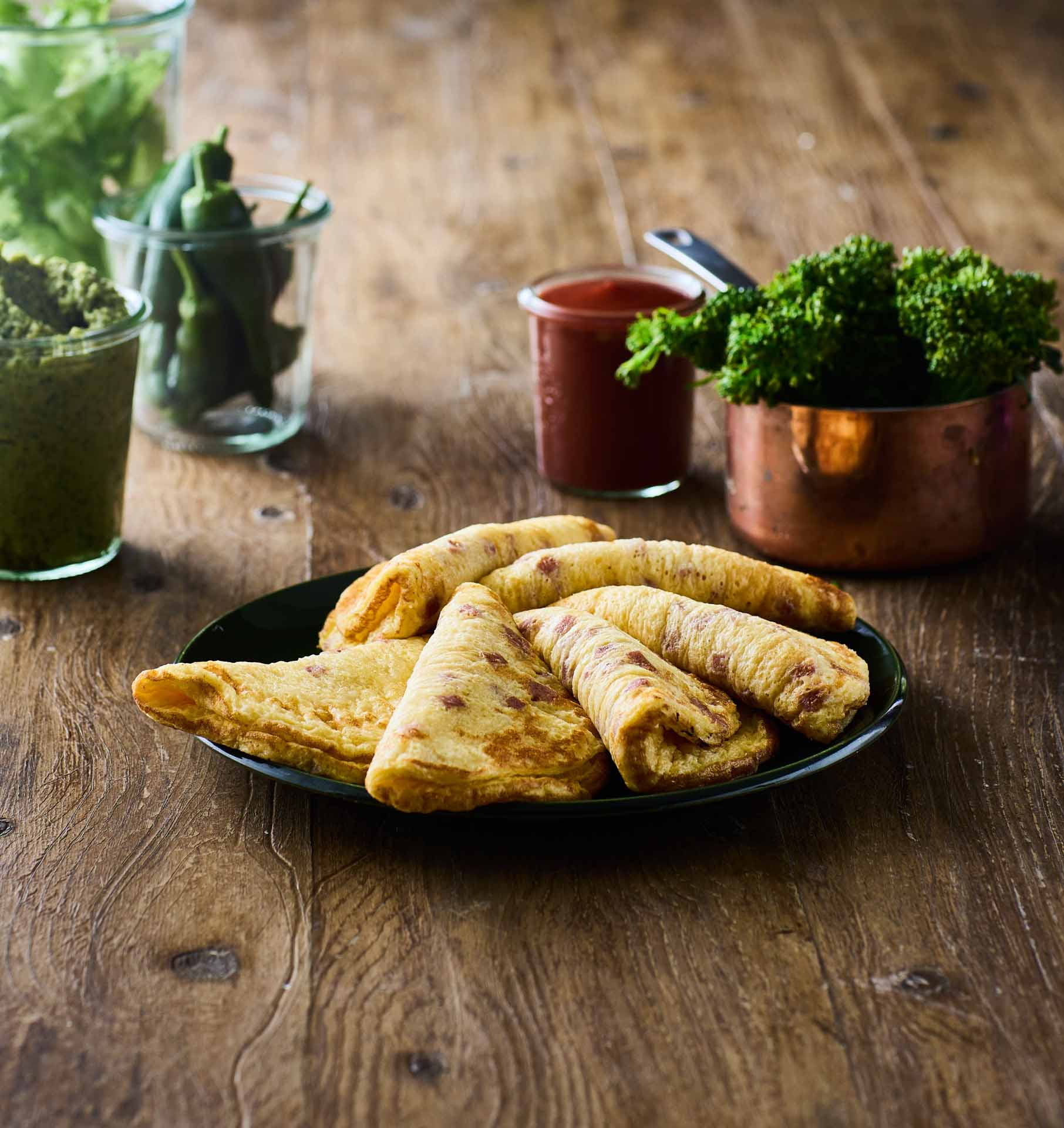 Lun en færdigstegt omelet med skinke og ost og server med sæsonens bedste grøntsager som fyld – for eksempel syltede rødløg og salat, let sauteret spinat, sprøde asparges, karamelliserede svampe eller sød, grillet peberfrugt.